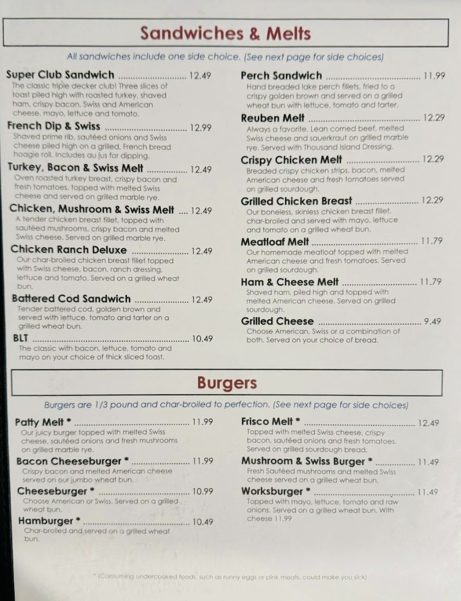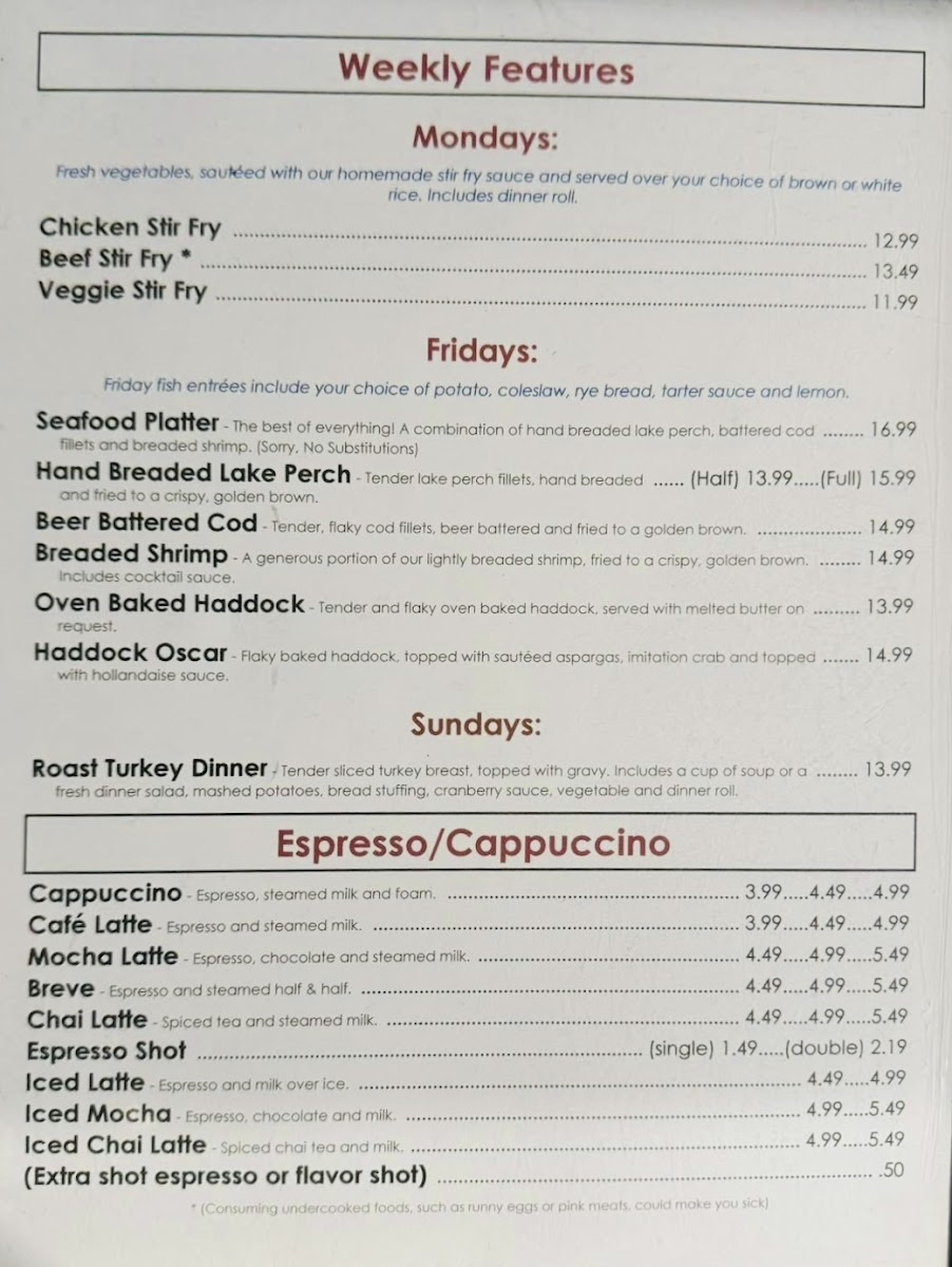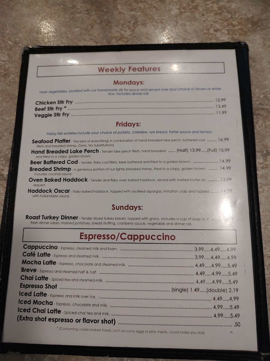 At lunch and dinner, you’ll find classic American fare including freshly prepared salads, burgers like the Frisco Melt or Bacon Cheeseburger, and comforting entrees such as Chicken Fried Steak and Haddock Oscar. Desserts like Carrot Cake and homemade Chocolate Cake offer a quietly satisfying end to any meal, paired nicely with warm beverages including a seasonal Peppermint Hot Chocolate.