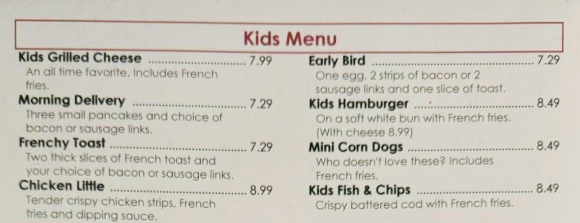 Mohnen's Family Restaurant offers a straightforward, comforting menu designed for casual breakfasts and familiar family meals. The selection centers on hearty, homestyle dishes that feel at ease in the warm, welcoming environment of this Appleton staple. Whether you're starting your day with a classic stack of Chocolate Chip Pancakes or enjoying a midday meal like the Meatloaf Dinner, the menu provides a variety of well-loved options to suit different tastes and appetites.
